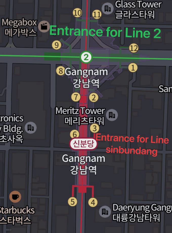 Because of that, the same station name can have different platforms for different lines. For example, at Gangnam, Line 2 and the Sinbundang Line share the same station name, but the boarding areas are not the same as the image above.