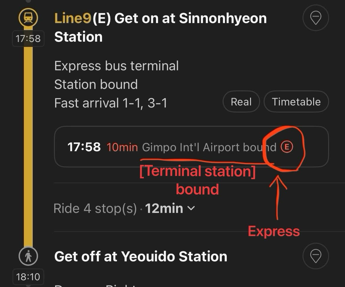 But don’t worry—NAVER Map already takes this into account when building your route. The route time table is calculated based on actual train patterns, including whether a train is local or express and where it terminates.